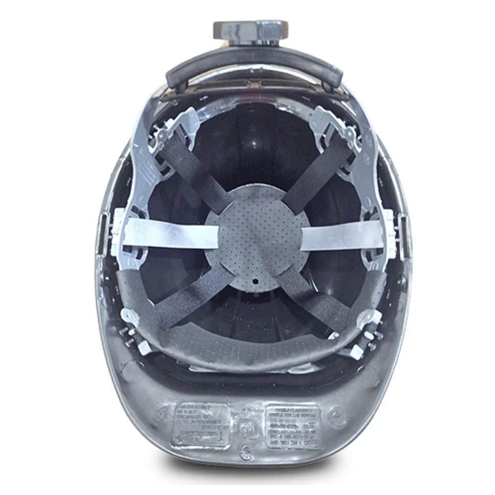 Casco de seguridad industrial fabricado en polietileno de alta densidad con canal en el borde para derivación de lluvia, Tafilete fabricado en polietileno de alta densidad.